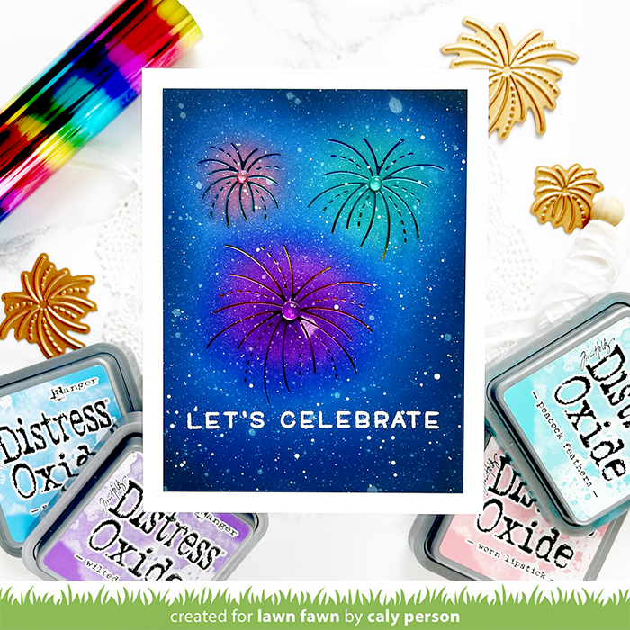 I hot foiled the Fireworks Hot Foil Plate with rainbow foil over white cardstock and ink-blended a festive night sky using Distress Oxide Inks.