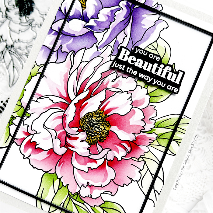 I’m sharing some more framed art today using the Altenew Billowing Peonies set. This stamp, stencil and die set is absolutely gorgeous! It’s a large set – 8.5″ x 11″! I used the Altenew Stampwheel to stamp the image with black hybrid ink on white cardstock and watercolor cardstock so I can use the stamp and stencil sets.