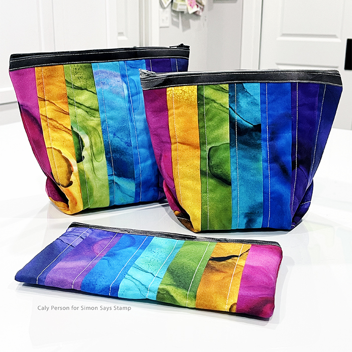 Now square off your panels – trimming off the excess so you can get as perfect of rectangles as you can for your bags and pencil pouch. After sewing/quilting all three projects, you’ll add 2″ stripes of the black color to the top and bottoms of the panels to bind and finish off the edges. It’s going to be really helpful to watch the video for this. Then, you’ll sew the zippers onto the black Alchemy fabric to form the tops of the bags.