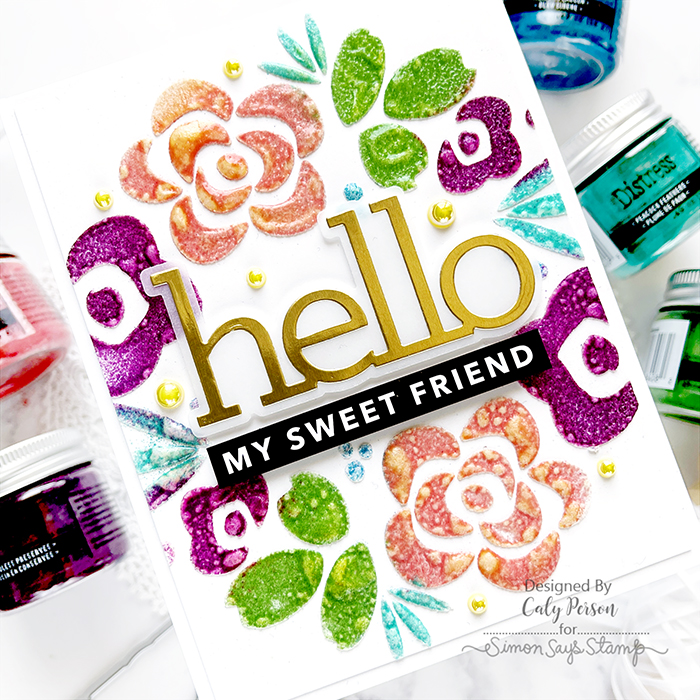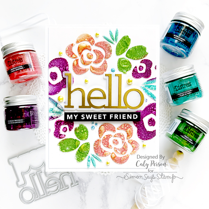 I finished with simple sentiments from the CZ Hello die and Reverse Bold Hello Sentiment Strips. Then to cover up some areas that didn’t get nice coverage with embossing glaze (because the paste dried with time), I scraped off the little dots of color and replaced them with some Sunshine Pearls instead.