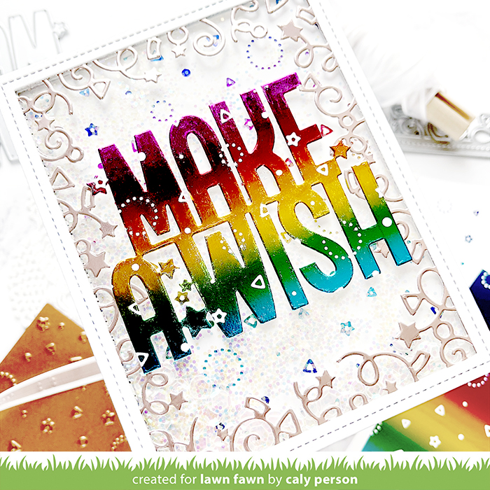 I hot foiled the Confetti Background Hot Foil Plate with rainbow hot foil for the background of my shaker card and also hot foiled the negative as well to die-cut the Giant Make a Wish sentiment.