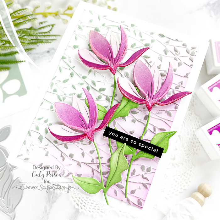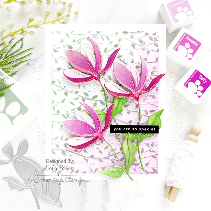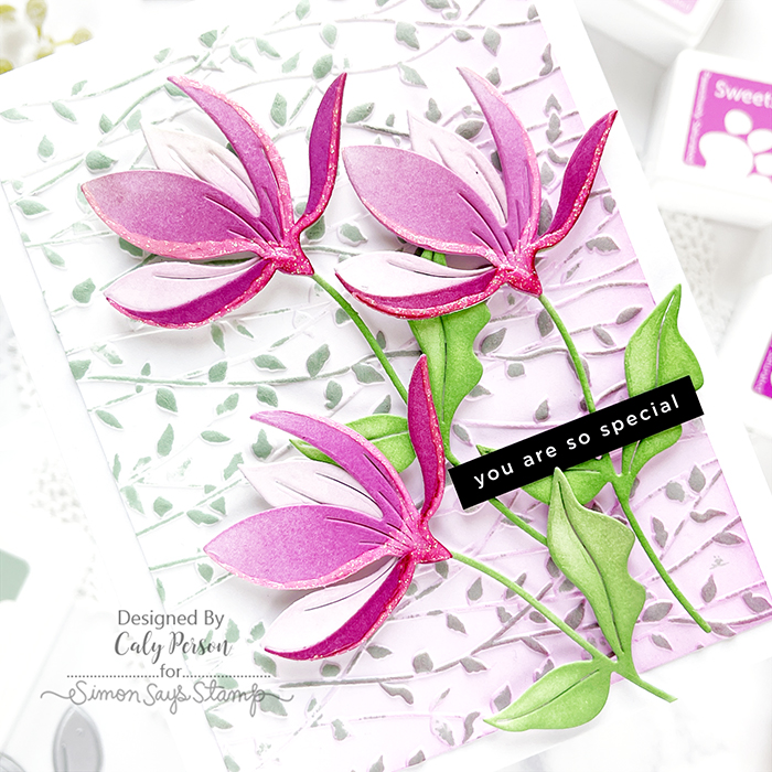 My card today features the Fresh Cut Floral Stem die. I die-cut three stems in white and ink-blended with Pawsitively Saturated inks. After piecing it all together, I added some Nuvo glitter gel to the bottoms of the petals – it almost bleaches out the ink and gives it a “highlight.”