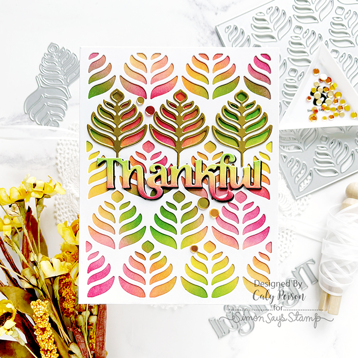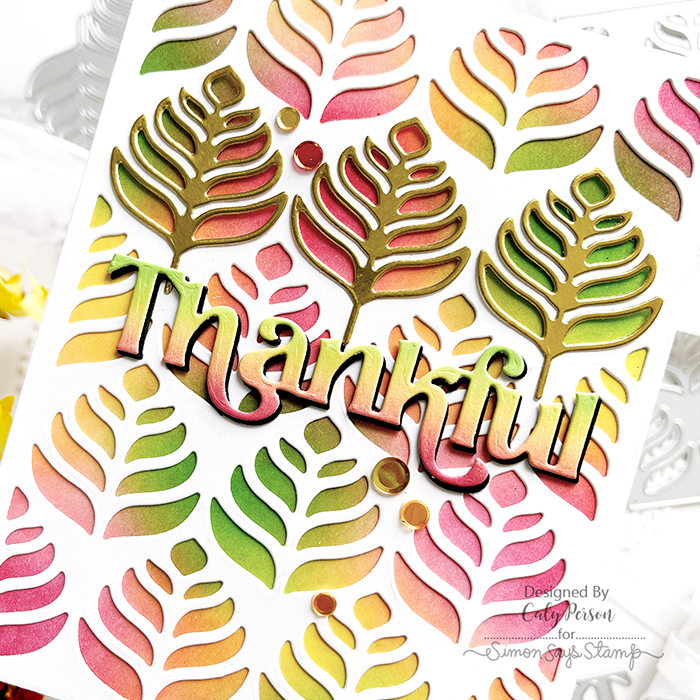 For the sentiment, I ink-blended the same colors on a piece of white cardstock before die-cutting the Fancy Giving Thanks die to get my sentiment. I didn’t use the shadow die included, but die-cut the word Thankful twice in black to stack underneath for a shadow. To finish, I added a few sequins from the new Orange Leaves Sequins mix.