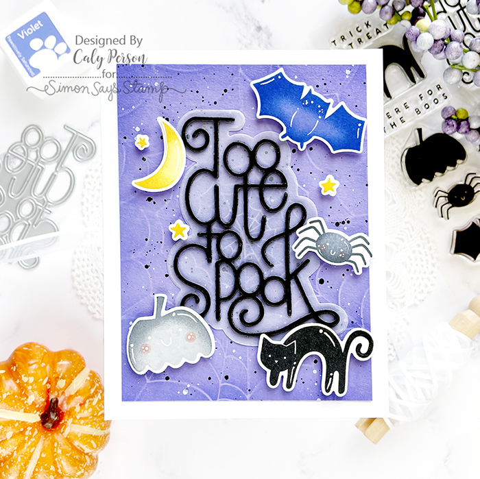 I created my background by ink-blending the Web stencil over lavender cardstock. I splattered it with black and white paint to give it interest and texture. Then I die-cut the Too Cute to Spook die using vellum and Black Glossy cardstock.