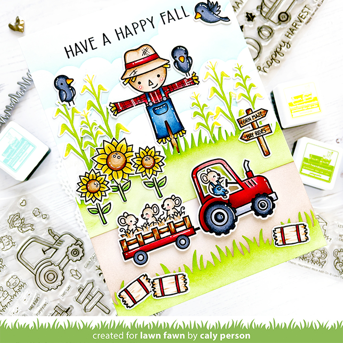 I paired the scarecrow with images from the Hay There Hayrides set as well as its Mice Add-on set. My card is a 5″ x 7″ card because I had to include all the cute images!