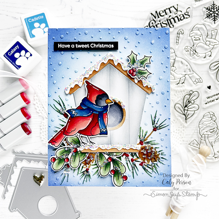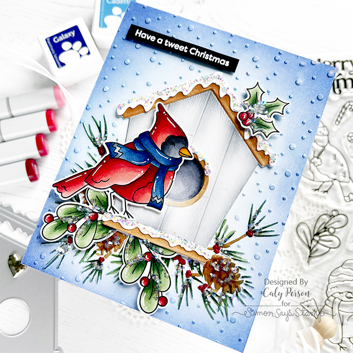 For the background, I ink-blended the snowy areas with blue inks (Cadette and Galaxy). To give the birdhouse and foliage color, I used Copic markers.
