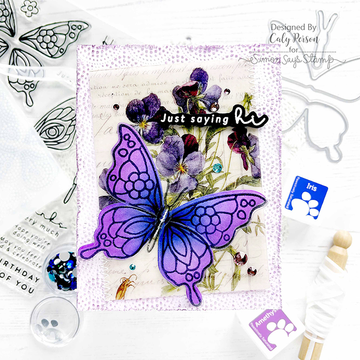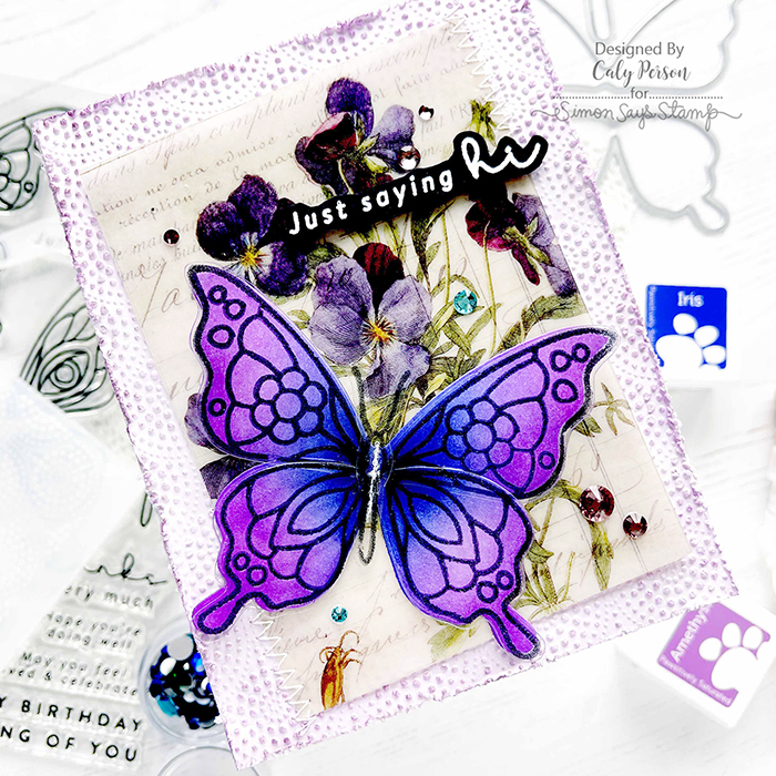 I attached the butterfly to the card panel and finished with an embossed sentiment and embellished the card with the new Pawsitively Dazzling Gems from Simon Says Stamp in Cool Tones (also a part of the kit).