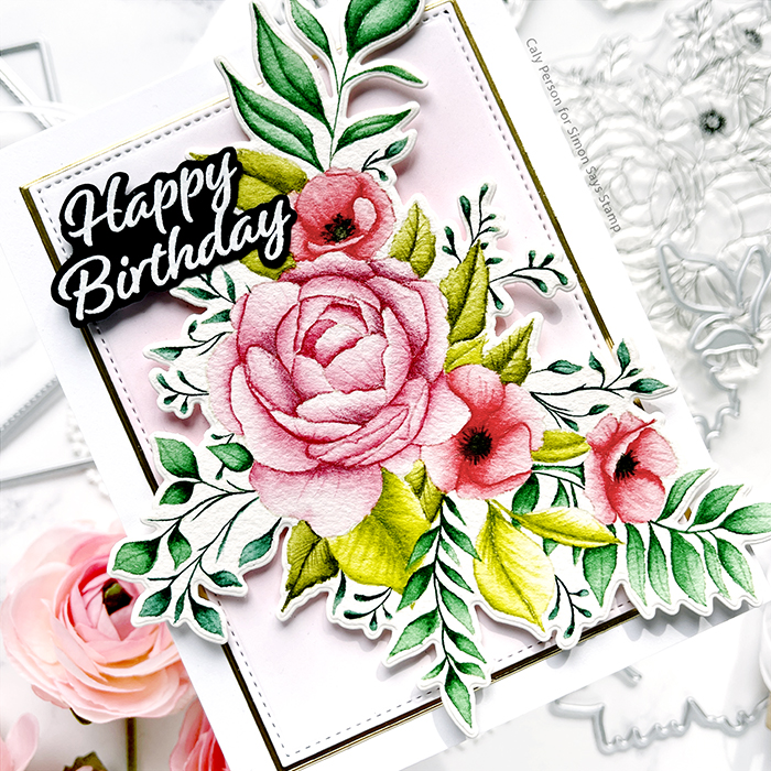 Gina K. Designs’ February release is here! My card features the new Peonies and Poppies set, illustrated by Hannah Drapinski. This bouquet is large and would fit on a 5″ x 7″ card without an overhang, but I kept the image in tact over a 4.25″ x 5.5″ note card.