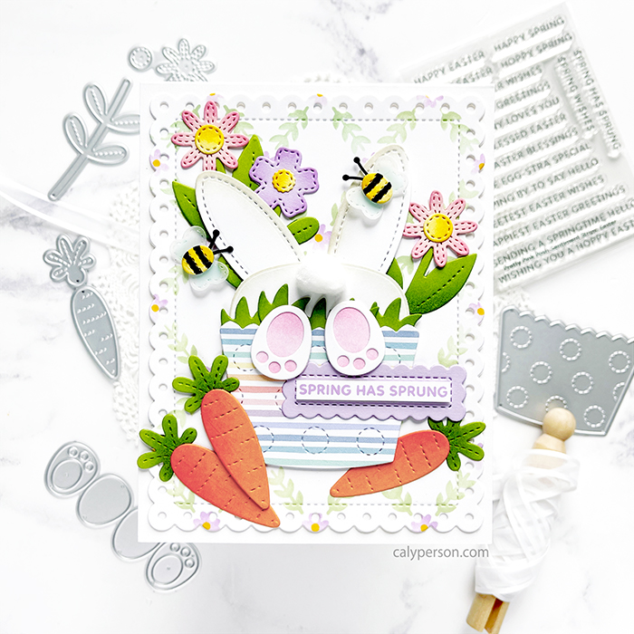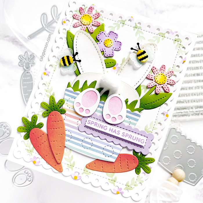 I used dies from the Spring Mug Additions die, Big Easter Cupcake die, and Bunny Face Shaker die to bring this card together. Lots of diecutting, ink-blending, and paper-piecing!
