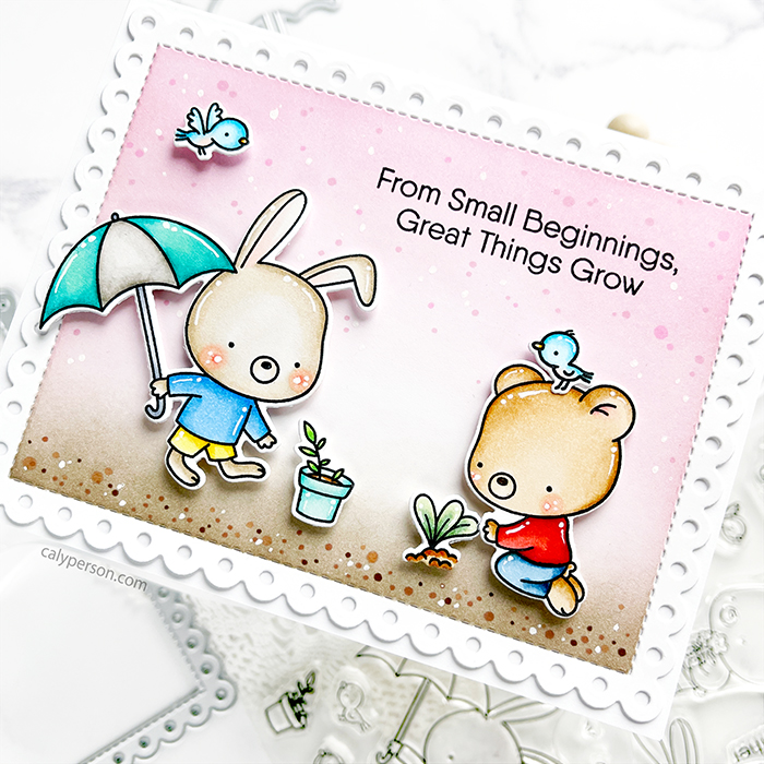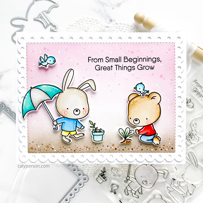 I know it’s Easter, but I’m just hangout out this evening and thought I’d snap photos of this card that I made last night to share. My Favorite Things always has adorable sets and I loved these cute critters from the You Bring Sunshine Set. It’s such an encouraging set!