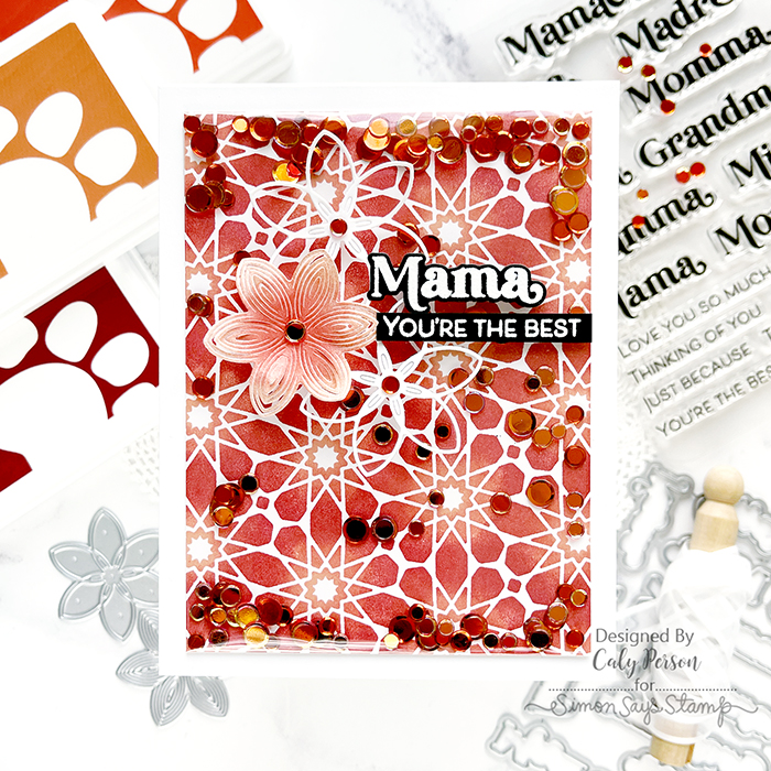 I used the new Terracotta sequins to fill up the shaker pouch I created (by wrapping cellophane around the panel) and embellished the front of the shaker with the new Whirl Blossom dies. I ink-blended the more solid flower with the new inks too. The sentiment is from the new Mamacita set, which is filled will great mom nicknames!