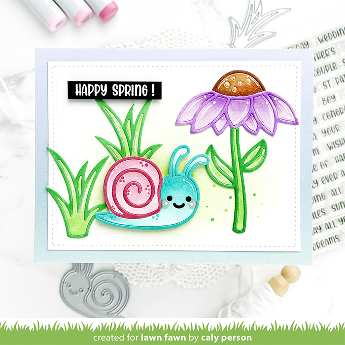 My paper-pieced card for today’s Lawn Fawn Inspiration week project features the Garden Snail dies. This adorable snail will be available on February 22nd! I’ve paired it with the previously released Delightful Daisy to make a garden scene.