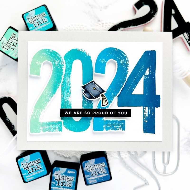My card uses the Tim Holtz Paint by Number set, which now comes with coordinating dies from Simon Says Stamp. You can get the Paint by Number set as a bundle! I used Distress Oxide inks (Cracked Pistachio, Peacock Feathers, Mermaid Lagoon, Uncharted Mariner, Chipped Sapphire) to stamp each number. The 2’s are stamped on a separate panel to be die-cut so I could overlap the numbers to fit on a trimmed down panel. Each number is stamped with two colors to continue to ombre/gradient from left to right.