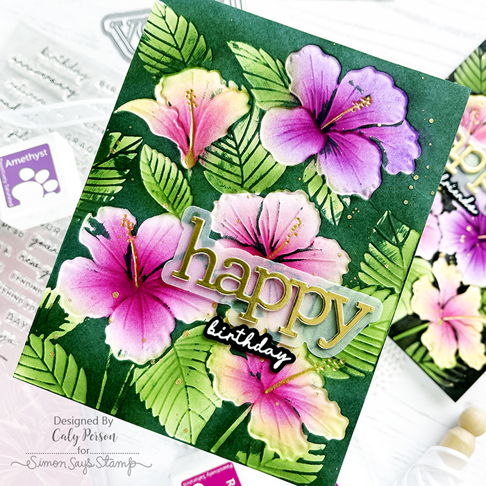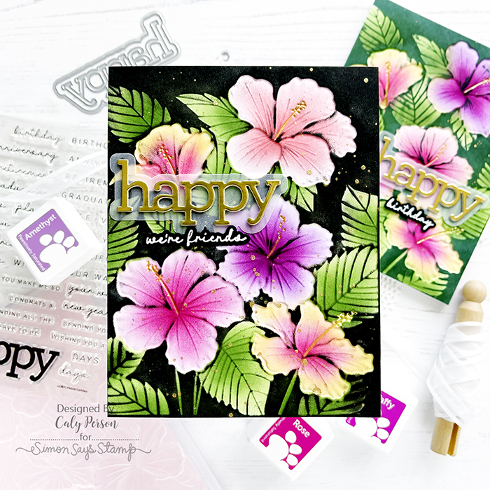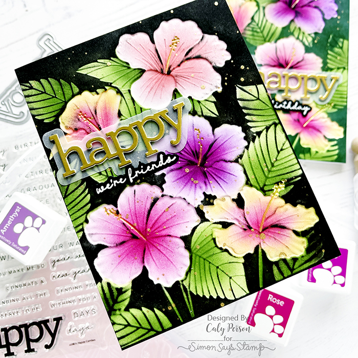 I used a gold pen (Sakura Gelly Roll Stardust Galaxy pen in yellow) and colored the hibiscus center stamen. Next, I used a black felt ink-pad to swipe against the negative space. It captures all the details and makes the flowers and leaves pop!