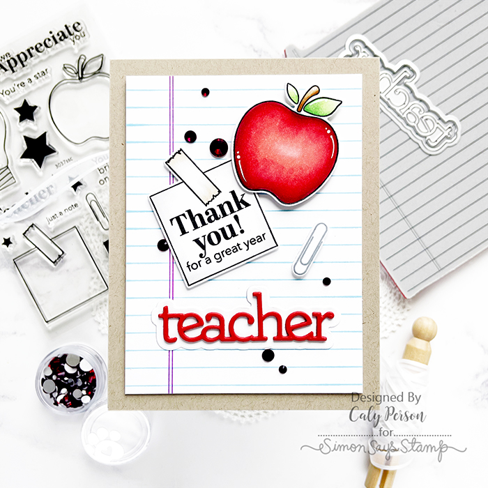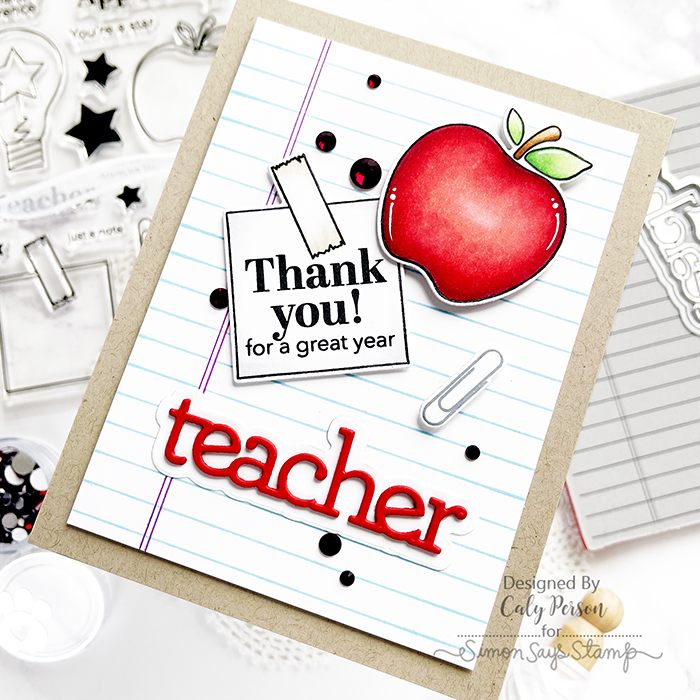 For the background, I stamped the Ledger Paper stamp onto white cardstock. I used a ruler and pink marker to trace the lines on the left to mimic that of real notebook paper. After trimming down the panel, I adhered the images and Teacher sentiment. I finished by embellishing the card with some Cherry Dazzling Gems.