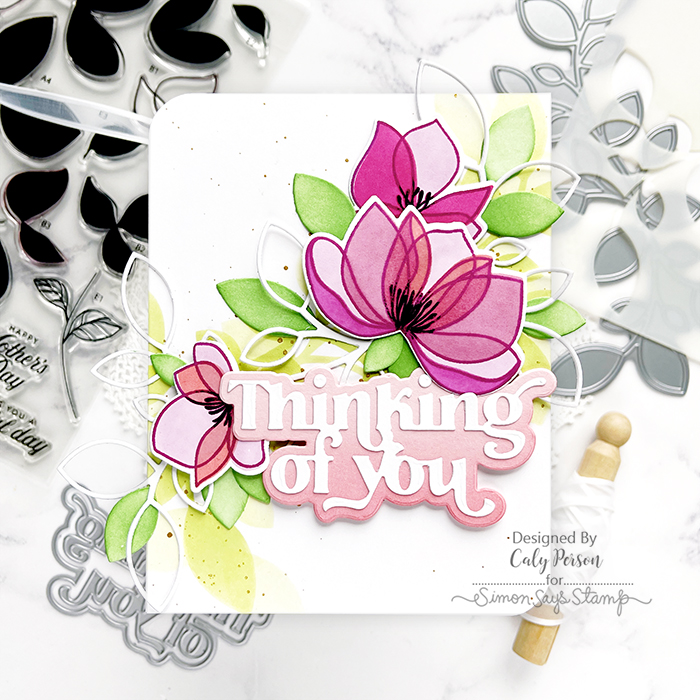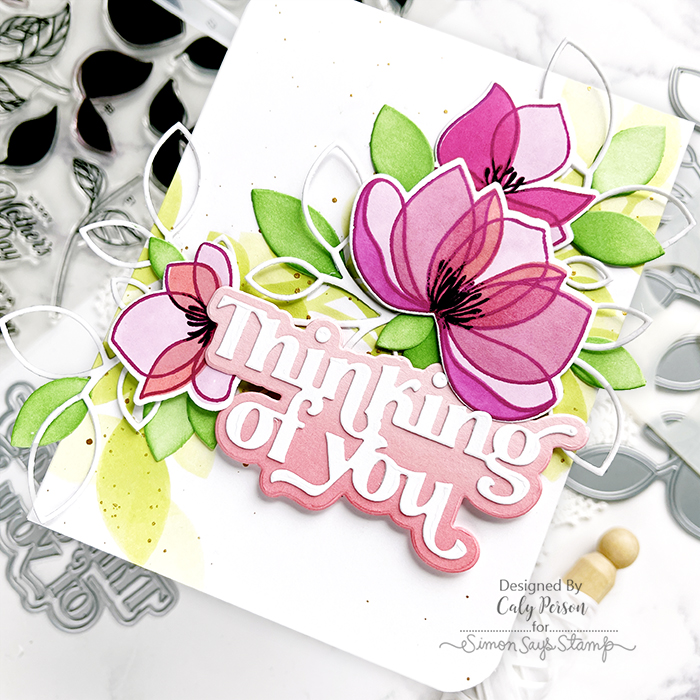 Before adding the Pretty Petals flowers and Outline Clustered Leaves, I splattered the background with gold paint. To finish, I used the Fancy Thinking of You sentiment die. I ink-blended a piece of pink cardstock for the shadow layer to give it more interest.