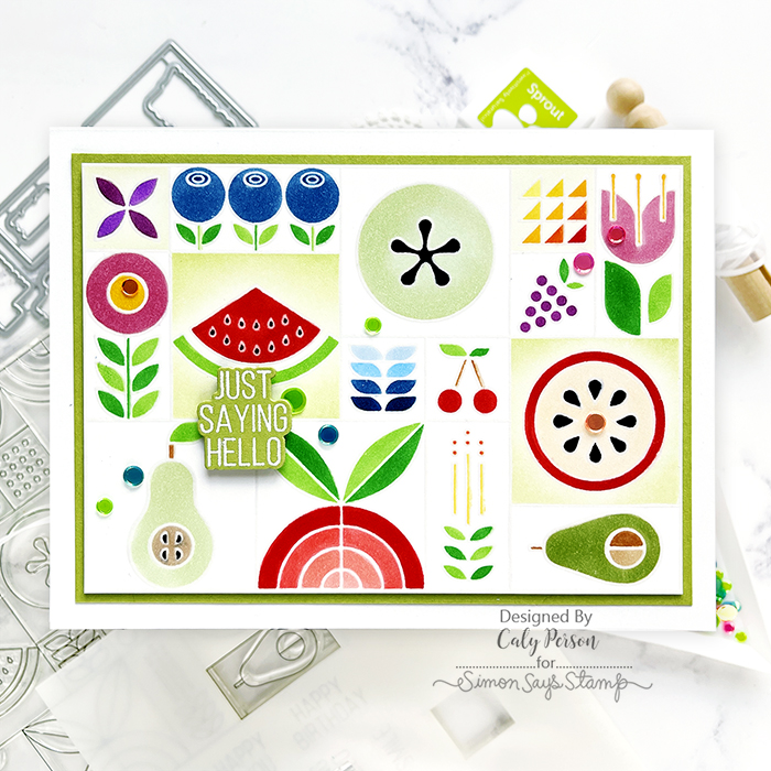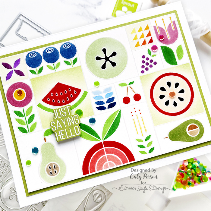 My card today uses the fresh and fun Summer Fruit Tiles set from the Sunny Vibes release. This set combines a stamp, dies, and stencil! I gave this set a long study before I got to work. That sounds funny, but it’s true! I wanted a no-line look and wondered how I could achieve that. In the end, I decided to emboss the stamped image with clear embossing powder.
