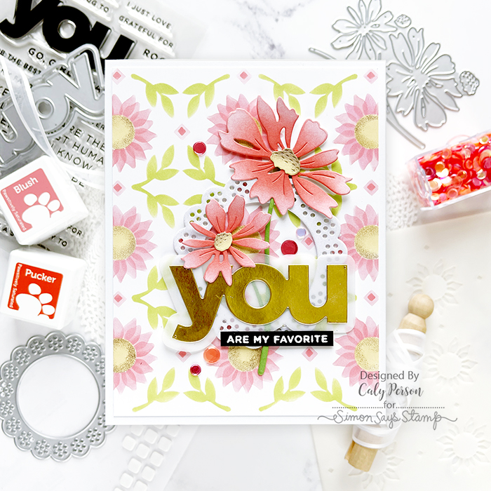 Today’s card uses more products from the Simon Says Stamp Cheering for You release. I used the Sunflower Pattern Stencils to ink-blend with pink for a more daisy-like feel. It makes the background pair better with the Cosmos Duo flowers.