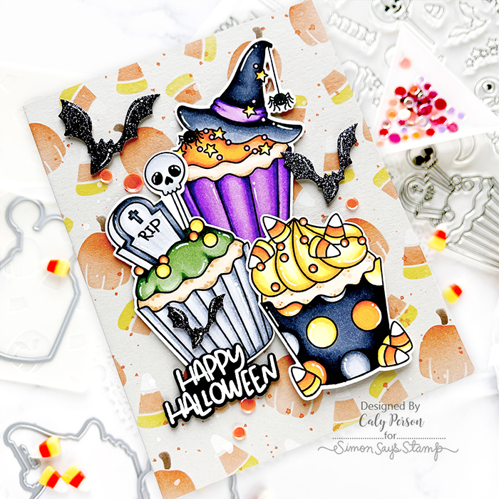 I stamped and colored the images with Copic markers. For the background, I ink-blended Halloween Candy over a piece of Fog cardstock. The Fog cardstock is great because it adds more color and allows me to use white ink for the top layer of the candy corn. I also splattered the background with orange and white ink before adhering the cupcakes over it.