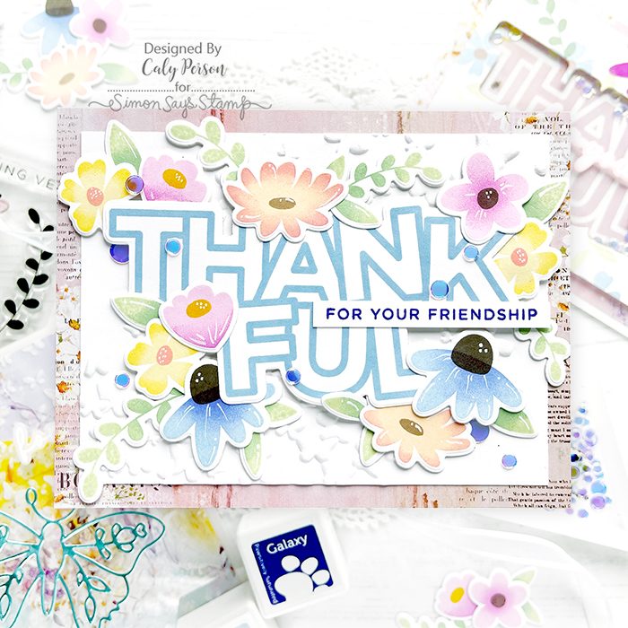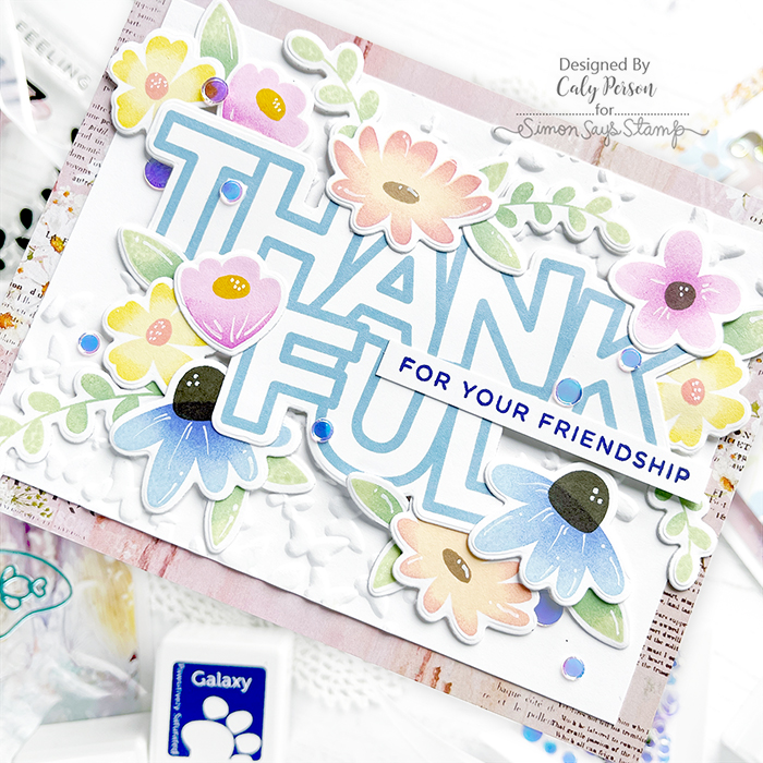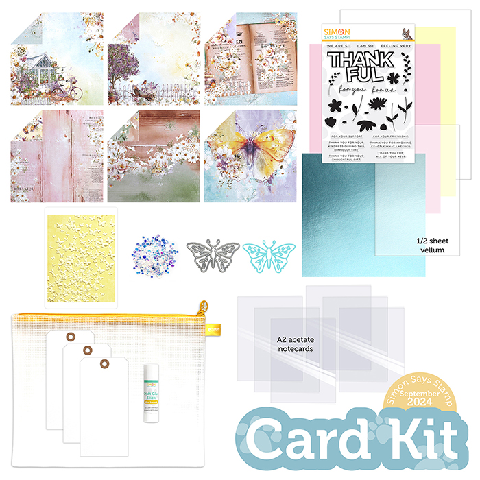 This second card is the card I created for the Simon Says Stamp social media channels. I stamped the Chunky Thankful Greeting flowers on a white panel that I die-cut the outline of the greeting into to create. shaker window. All products used for this card are also from the September 2024 Card Kit.
