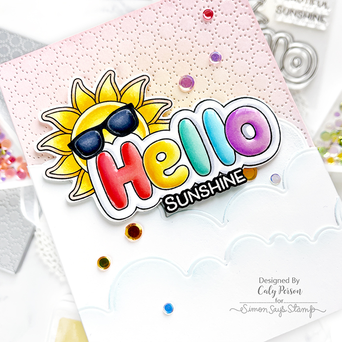 For the background, I ink-blended Butter and Blush Inks on a white panel, then used the Pinpoint Circle Background die to give it texture. I then layered Cloud Borders to give my background a more scenic look for the sun image. I finished with embellishments from the Garden Blooms and Summer Sunset mixes.