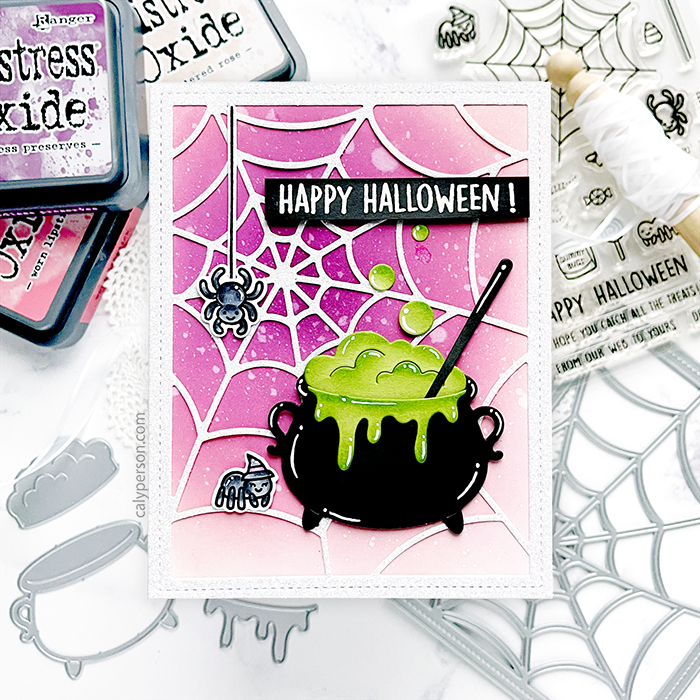 Next, I used the Build-A-Cauldron set and die-cut the pieces uses dark gray and green cardstock – easy peasy! I addd some black ink and green ink to shade, but that was quick and simple too. For the background, I wanted it to be more colorful, so I ink-blended with Distress Oxide Inks in Tattered Rose, Worn Lipstick, and Seedless Preserves. To give it some texture, I splattered it with some water. The sentiment is from the Sweet Spiders set.