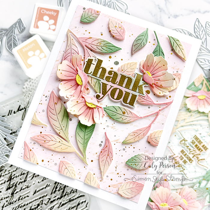 For my second card, I used all the loose foliage from the Arching Leaf Border dies because I didn’t want them to go to waste. I ink-blended a pink panel for the background and did the same with Old Letter on a background, but using the orange ink (it’s a lot lighter on this panel). To give the foliage dimension, I attached each leaf with 3D foam squares.