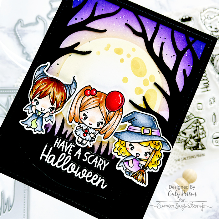 I stamped and colored three of the images with Copic markers. For a background, I set up a spooky Halloween scene using some Lawn Fawn products.