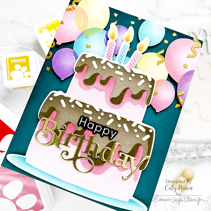 I have a festive birthday card to share today using products from the Simon Says Stamp Sweet Wishes release. Both the cake and balloons are stenciled, so to help them stand out, I adhered them to a darker background.