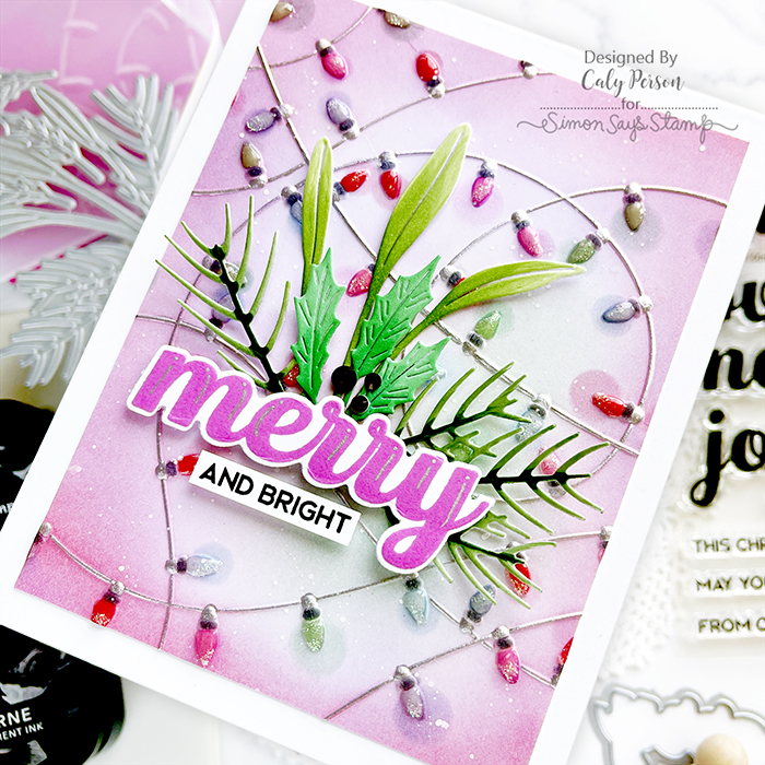 I used the Christmas Tangle Embossing Folder and Stencils to to make the background. I first embossed a white panel, then I added silver to the Christmas light strand. Next, I ink-blended with the coordinating stencils. After ink-blending, I added color aroudn the card panel using pinks, purples, and greens from the same inks I used for the light bulbs. I then added Glossy Accents to the bulbs to give them shine and dusted on some Unicorn Dust for shimmer before it dried.