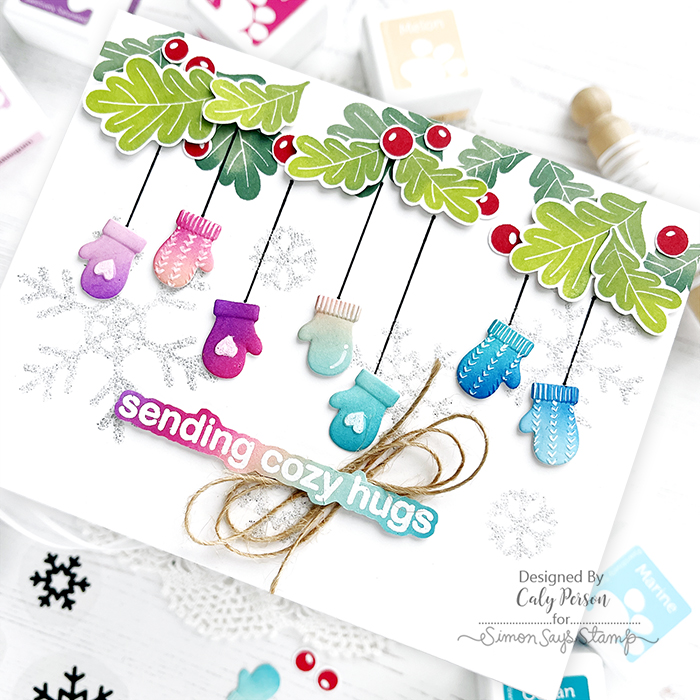 The adorable little mittens are from the Bundled Up embossing folder and die set. I ink-blended a panel in rainbow colors (Cranberry, Pearfection, Kale, Bubblegum, Amethyst, Peony, Melon, Seafoam, Ocean, Marine) and used it to die-cut the mittens to get the pretty range of colors across the panel. Then I placed the little mittens inside the embossing folder and embossed them with the fun patterns.