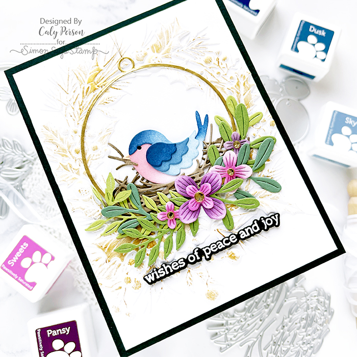 The background uses the Holly Wreath embossing folder. I kept it simple by rubbing on some gold Lunar Paste (Slippery When Wet color). Next, I die-cut, ink-blended, and pieced together the dies for the Hanging Leaf Ring, Jolly Birdie, and Rustic Nest.