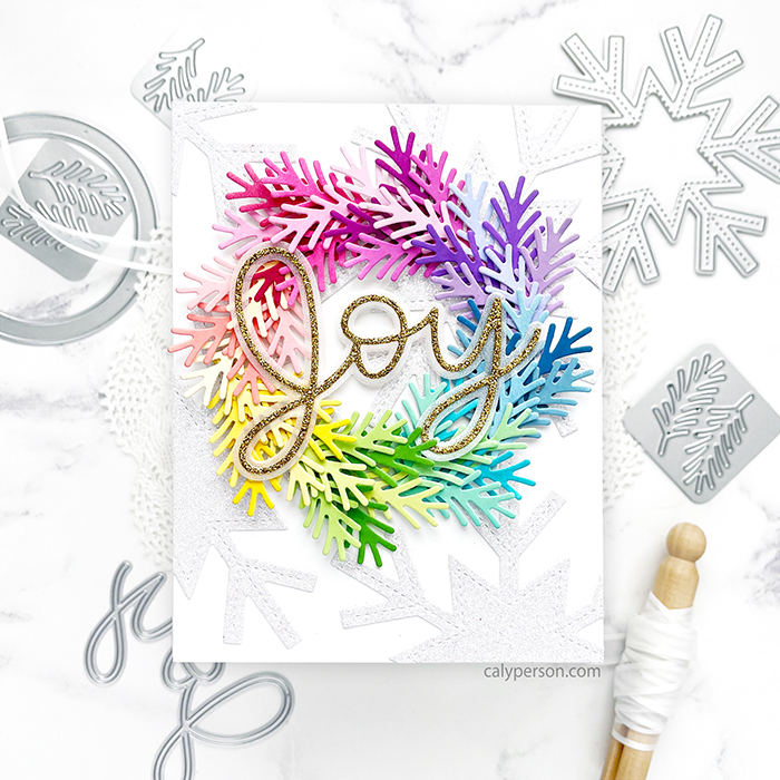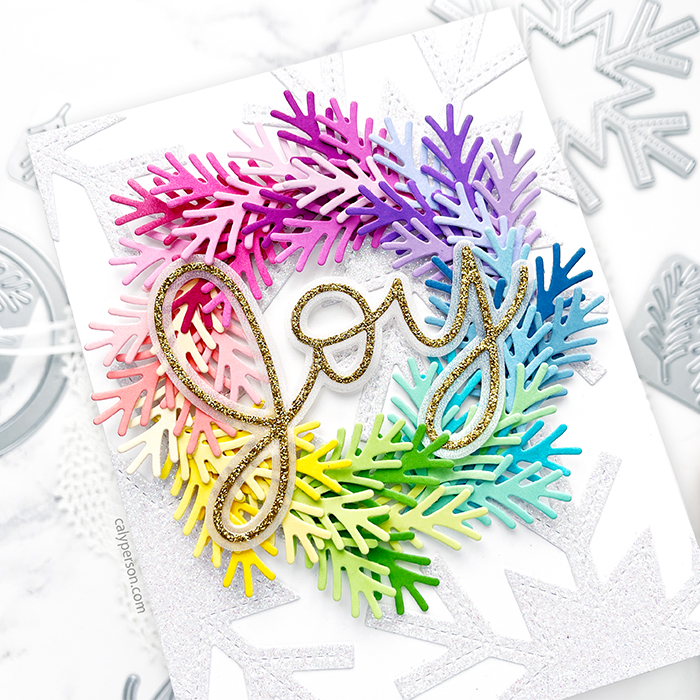 The background uses the Snowflake Shaker die. I die-cut it a few times to make a background using White Glitter Cardstock. It gives it such lovely shine and shimmer! For the sentiment, I used the Large Joy Shadow die and die-cut it with Shimmer Vellum and Gold Glitter Cardstock. The background and sentiment are simple, but the colorful wreath is meant to draw the eye. I hope you like this card!