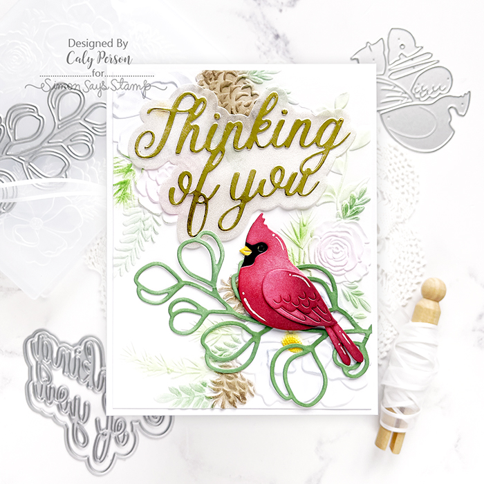 The background uses the Woodland Floral Frame Embossing Folder that I ink-blended lightly for a bit of color. I also ink-blended a Eucalyptus Branch for the cardinal to perch on. The Scripty Thinking of You sentiment finishes the card in gold cardstock over new Shimmer Vellum.
