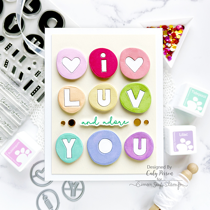 The dies cut the image of the stamps without a white border. For this reason, it’s easier to die-cut first. I stamped my Circle Sentiments in rainbow order, spelling out “i luv you” and added a sub-sentiment with another scripty sentiment from the stamp set. The stamp set also includes some fun patterns for the letters, but I opted to keep them white.
