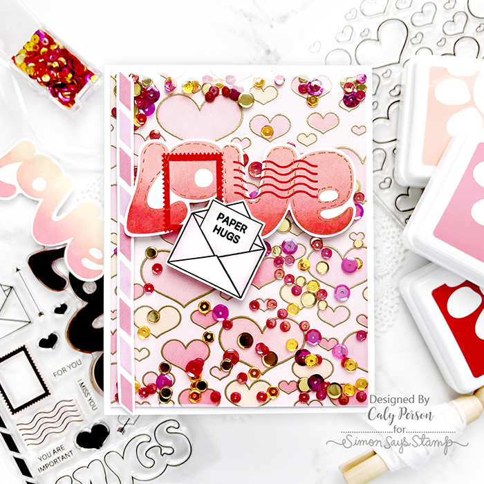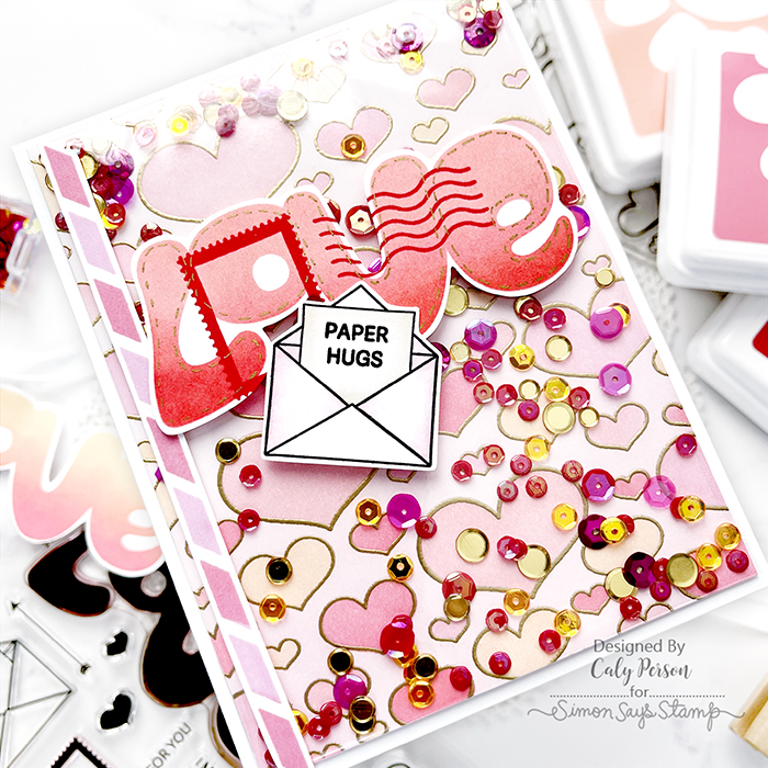 I used the Outline Hearts stamp to emboss the hearts in gold and used the coordinating stencils to ink-blend with a few different shades of pinks and peach. I made the infinity shaker pocket using cellophane (stamp/die packaging) and filled it with the Hot Tamale Embellishment Mix.