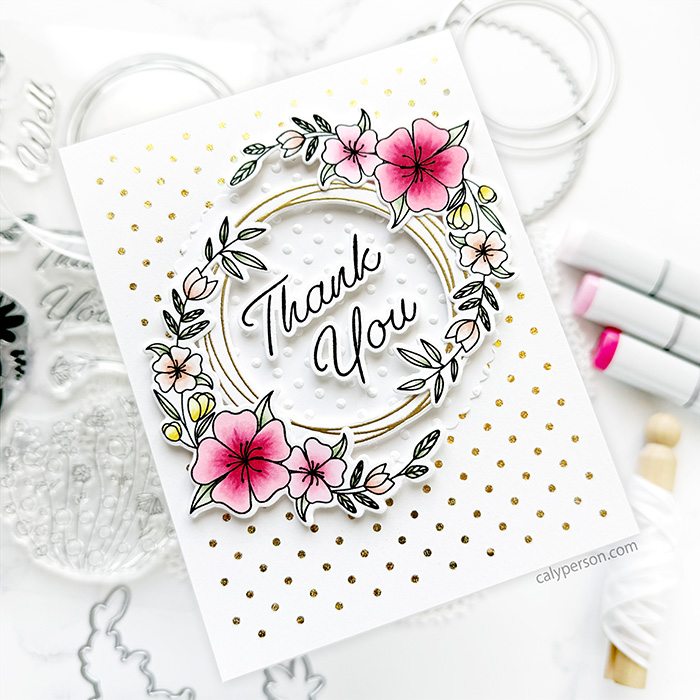 The Gina K. Designs release just dropped. I have a card to share, using the new Roundabout Florals set. I stamped and colored it with Copic markers. I added elements with gold foiling and a 2D embossing folder to give it more interest.