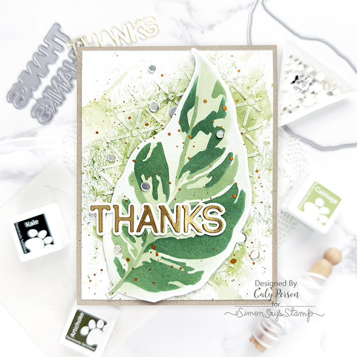 Today’s card adds the White Fusion leaf set to the collection of tropical foliage by Miriam Prantner. I ink-blended this leaf and added it over a textured background that I made by ink-smooshing the same inks on the leaf. I added a pattern with the Dash & Dot stencil using some paste and splattered everything with gold paint. Be sure to check out the new Rain or Shine release from Simon Says Stamp to see what’s available!