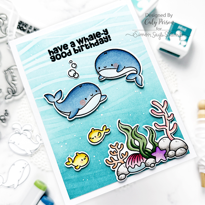 The Simon Says Stamp Rain or Shine release contains several new stamp sets that are great for scene-building! Today’s underwater card uses the Get Whale Soon set that I stamped and colored with Copic markers. The background is simply ink-blended with the Waves stencil.