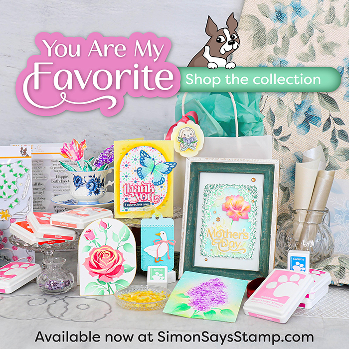 My card today uses the Mandala Blossoms set (stamps, dies, and stencils) from the Simon Says Stamp You Are My Favorite release. After ink-blending with the stencils, I added details using a white paint pen. The background is embossed with the Wavy Background stamp with gold embossing powder to compliment the Mandala Blossoms image.