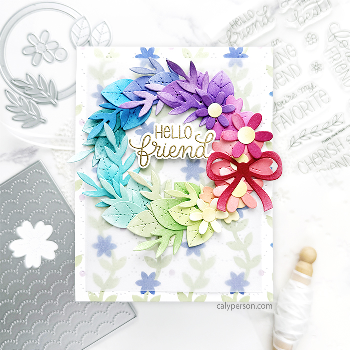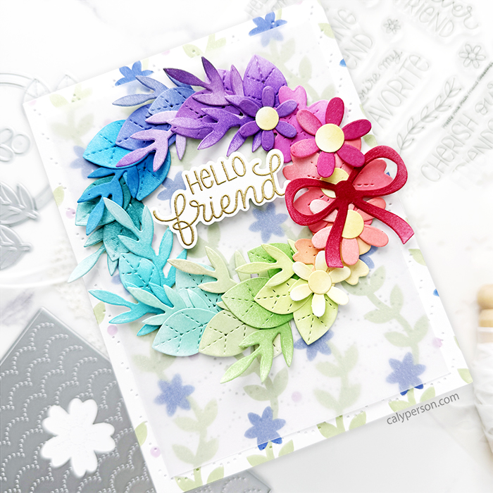 I stenciled the background with the Layering Blooming Vines Stencils and added texture using the Scallops Pierce Plate Die. To provide a soft layer, I added vellum. To make the wreath, I die-cut everything using white cardstock and ink-blended to form the rainbow wreath. I finished with an embossed sentiment from the Friend Greetings set.