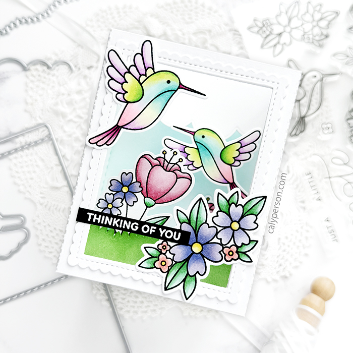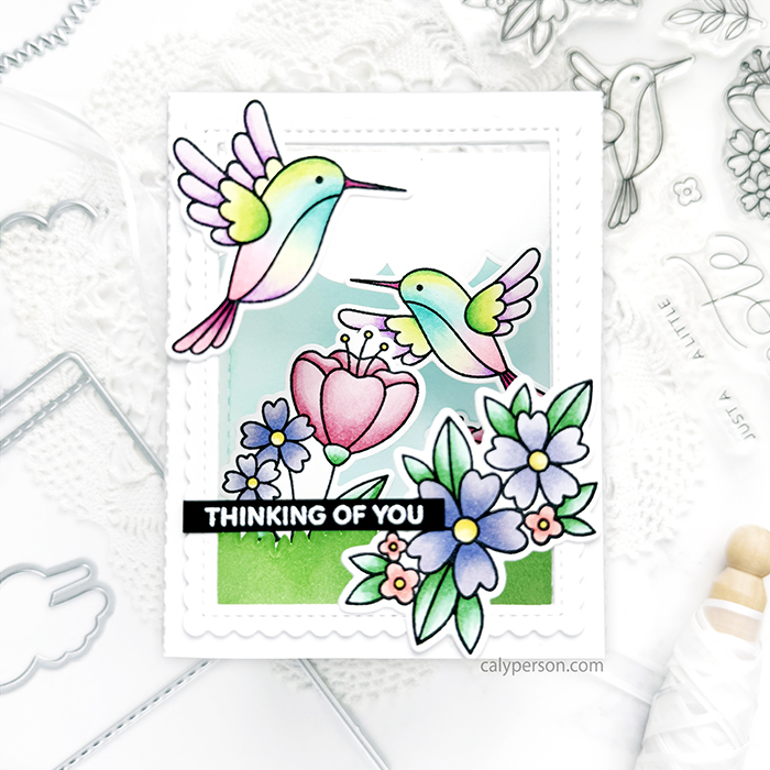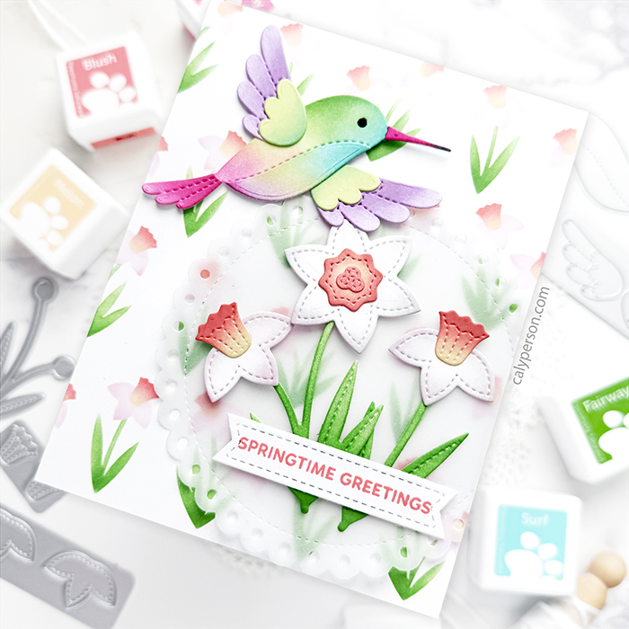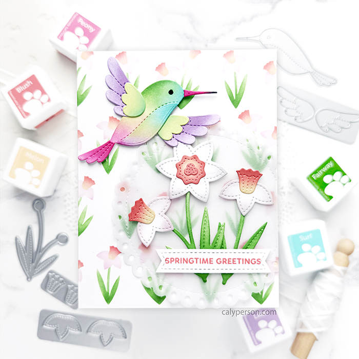 The background is ink-blended with the Daffodil Stencils. The paper-pieced daffodils are from the Spring Floral Dies. The Hummingbird is from the Stitched Hummingbirds Dies.