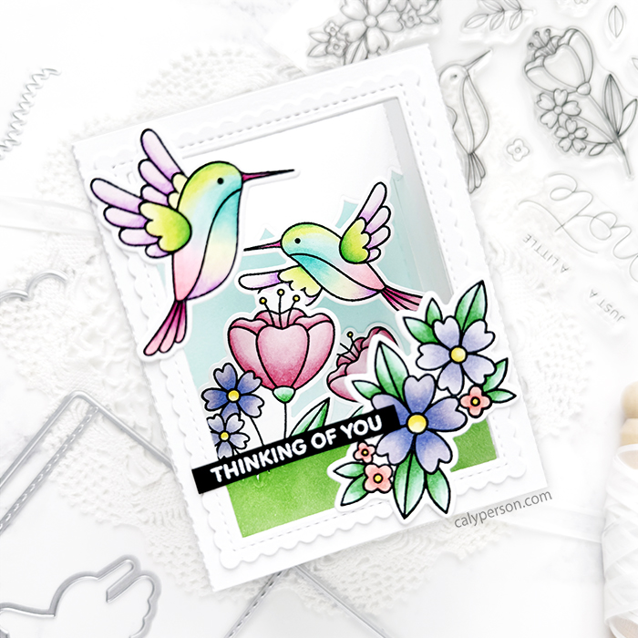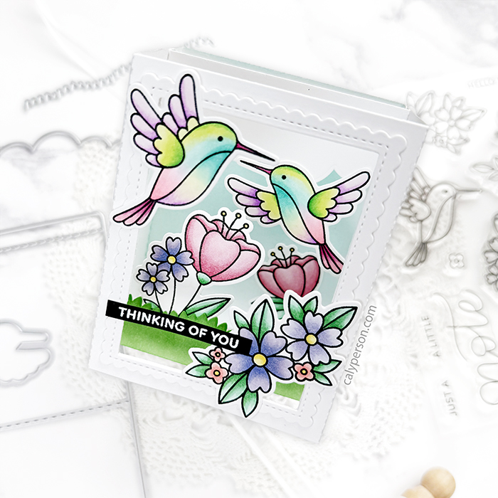 The Shadow Box Dies created the box with a grass layer and a cloud layer. I decorated the Shadow Box with images that I colored from the Hummingbird Floral Set. This box collapses to an A2-sized card that fits inside an A2 envelope.