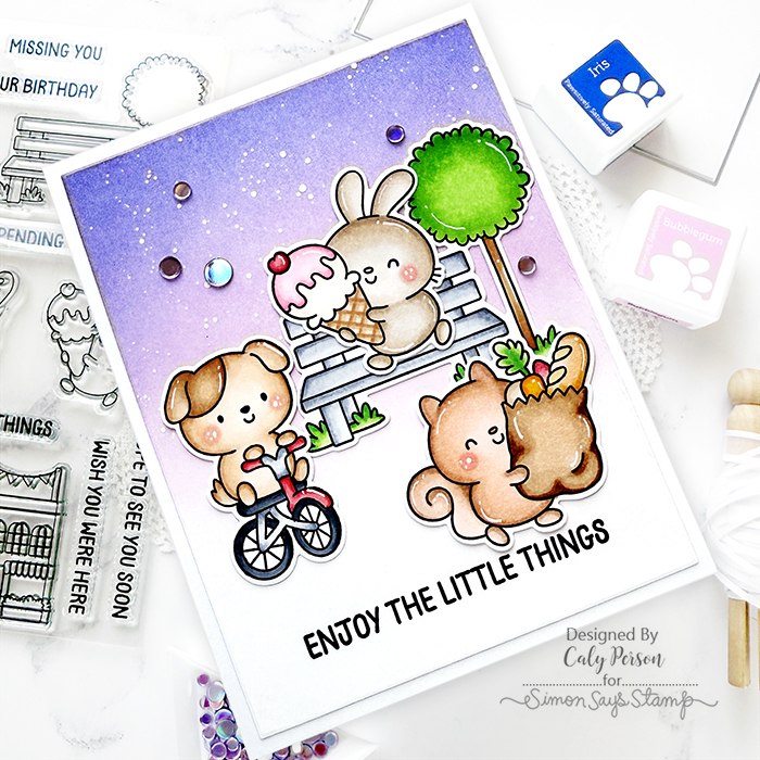 My card today features the adorable set called The Little Things from the Simon Says Stamp You Are My Favorite release. This 6″ x 8″ set has several images of critters out and about doing everyday things. I used 4 of those images for today’s card. Enjoy!