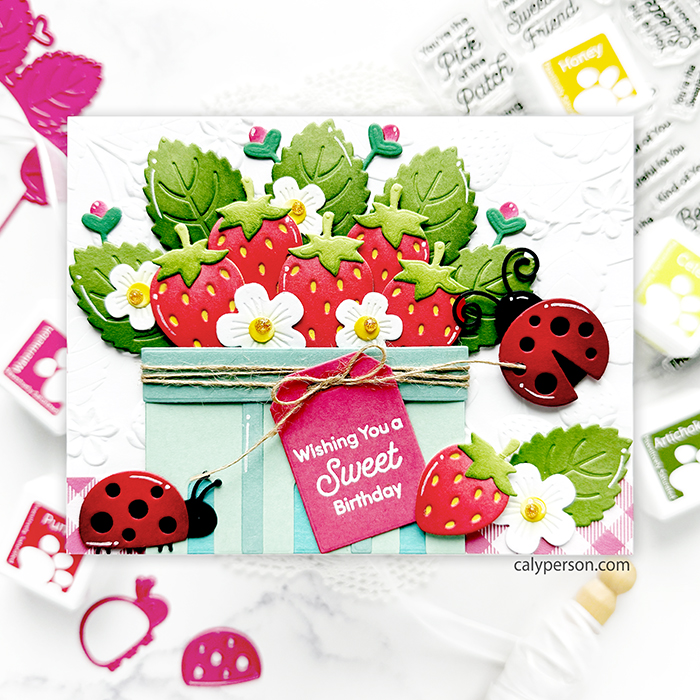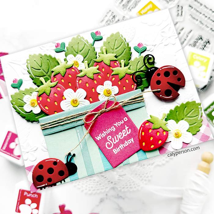 It’s been a busy few days, but I’m home after the Create Together LIVE Bee Card Class at Simon Says Stamp headquarters! I spent a lot of my day yesterday catching up on groceries and after dinner, I sat down to play with a few new products from Pink & Main. I just couldn’t pass up on the opportunity to piece together these adorable Ladybugs and basket of strawberries! The Berry Pop Up Card Dies creates a 3D pop-up box card, but I turned it into a 2D card on an A2 sized notecard instead. I added dimension with ink-blending and an embossing folder in the background. This card is so sweet and I hope it will brighten up someone’s day!