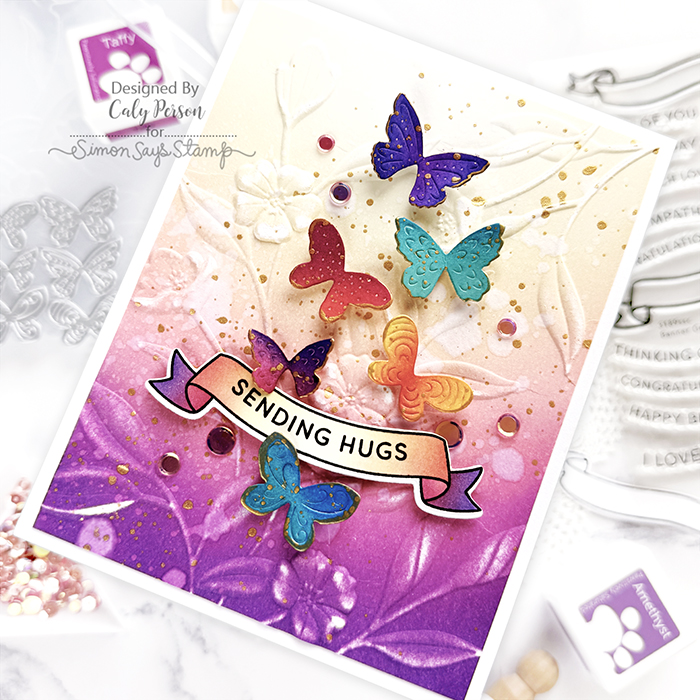 My card today combines a few products from the Simon Says Stamp Moments in Time release. The background is ink-blended and then embossed with the Floral Bunches embossing folder. I ink-blended and added gold details to each of the Bright Butterflies and finished with a Banner Greeting.