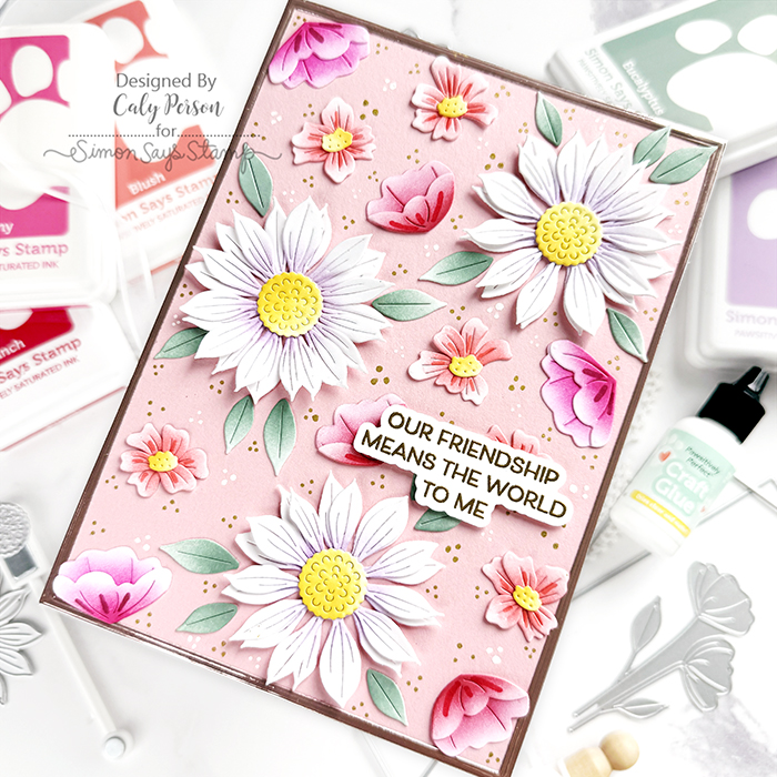 My card today is a combination of several new dies available from the Simon Says Stamp Friend Like You release. I used three new floral die sets (Jaunty Sunflower, Delicate Wildflowers, and Arctic Poppies) to make a background on an 5″ x 7″ card. There is a new A7 Rectangles Dies set, which I used to make a border to frame the card. To finish, I filled in the extra space with gold and white dots. Details are below!