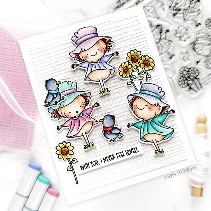 I’m sharing a cute scarecrow card today using the Field of Dreams set from Pink & Main. I just adore these scarecrow with their chubby faces and round bodies! I stamped and colored the images with Copics and backed them against an embossed background using the Burlap Embossing Folder. It’s a simple card/layout and the cuteness does all the work!