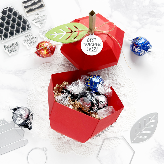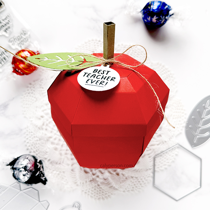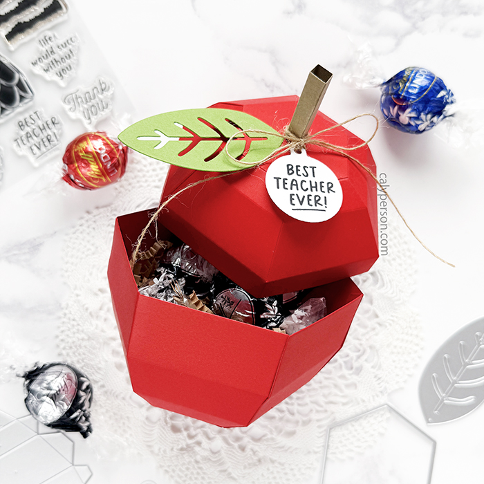 The apple created is straight forward. I die-cut with red cardstock and added a brown stem and green leaf.