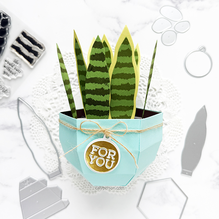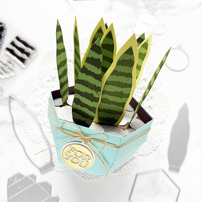 For the snake plant, I used the larger leaf die to die-cut a yellow-green color to create a border for the center leaves/stems. My brain gets quite literal when I’m trying to recreate nature. It felt wrong not to have that yellow-green border like on real snake plant leaves. I did add a few on the outer edges without just to show a size variation. I also spent a lot of time filling the planter with 3 shades of stones.